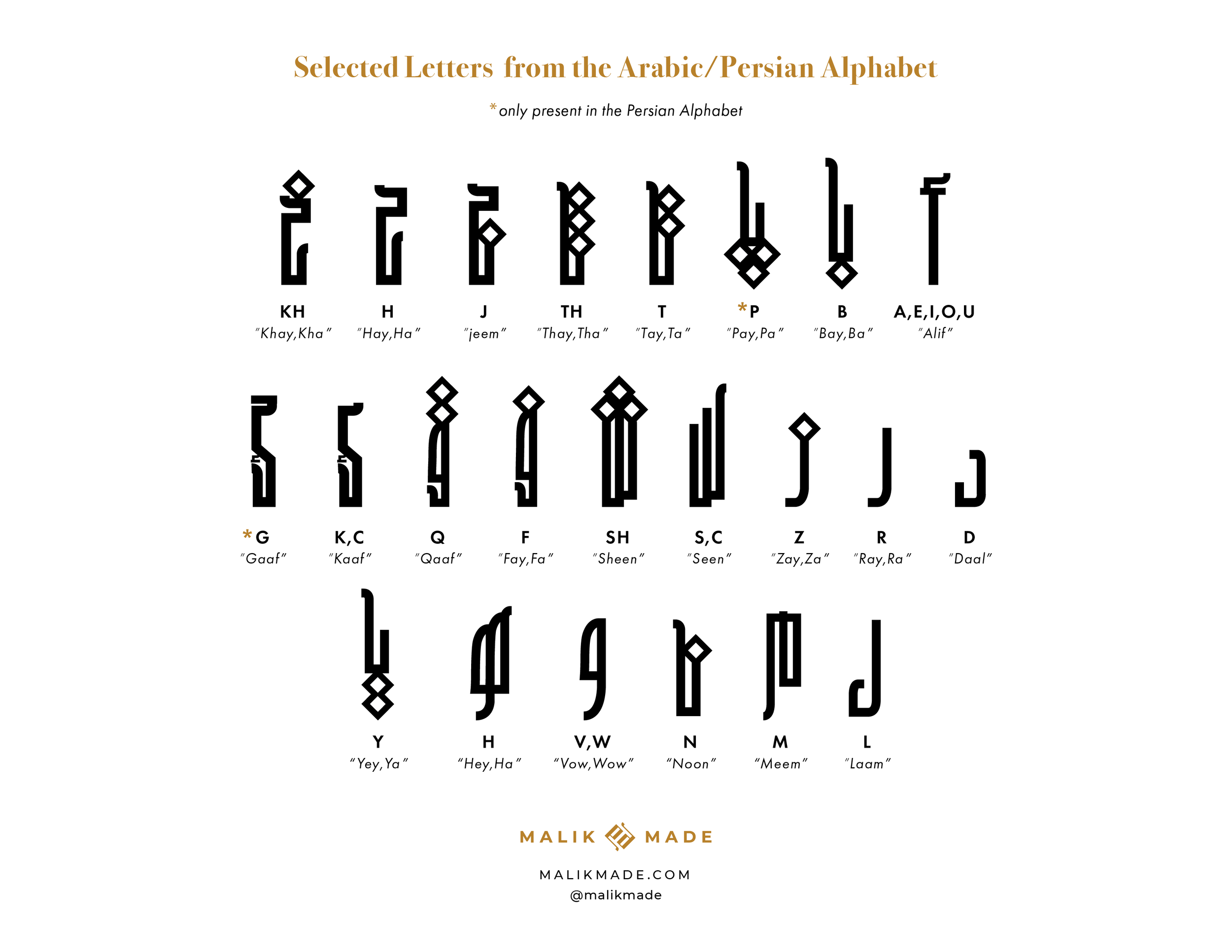Since the fall of 2015, Madiha gave a new life to her grid paper sketches in the form of jewelry and three-dimensional art. Below is a set of unique Arabic/Persian alphabet letters she designed for one of her first her jewelry collections—feel free to save and share! Find your initials and learn about the characteristics of the linguistic Arabic/Persian alphabet.